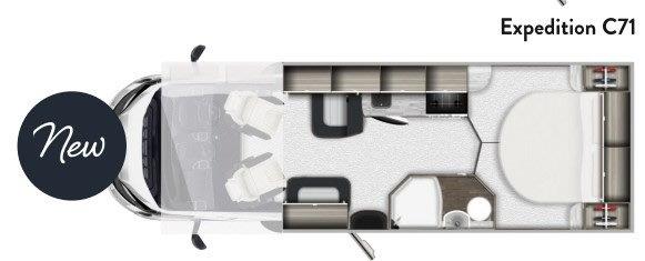 The Expedition C71 is just 7.25m, with open plan front dinette with swivel cab seats and two further travelling seats with belts. Over-cab double bed and dinette conversion to give 4-berth. End bedroom with fixed island bed. Great bathroom with shower, located opposite the kitchen. Fantastic value for motorhome with a fixed island bed!